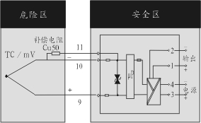 防爆标志:[Exia] ⅡC 电 源:24V DC±2V 功 耗:约1.5W(24V供电,20mA输出时) 危险区输入信号:J、K、T、E、S、B、R热电偶 量程范围: | 分度号 | 量程范围℃ | | E | 0~1000 | | K | 0~1300 | | S | 0~1600 | | B | 400~1800 | | R | 0~1600 | | T | -200~+300 | | J | 0~600 |