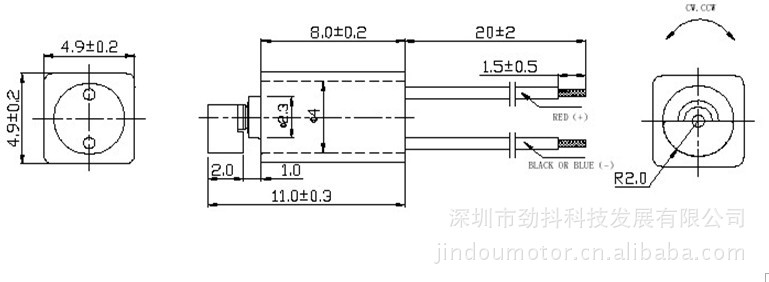 马达机身直径4mm,摆锤尺寸R2.0*2.0,胶套尺寸4.9*4.9*8.0,导线20mm(摆锤尺寸、胶套尺寸和导线长度均可按客户要求制作供应)