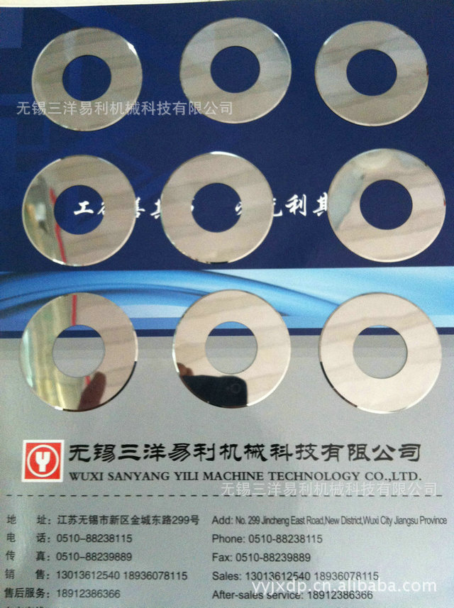 | 三洋易利分切刀片主要用于纸张,薄膜,金,银箔,铜箔,铝箔,磁带等物品的分切,要求刀片切断阻力最小,耐磨性.出于对商品精度的要求刃具有时须达到微米级精度,选料:9CrSi,Cr12Mov,W6Mo5CrV2,W18Cr4V等