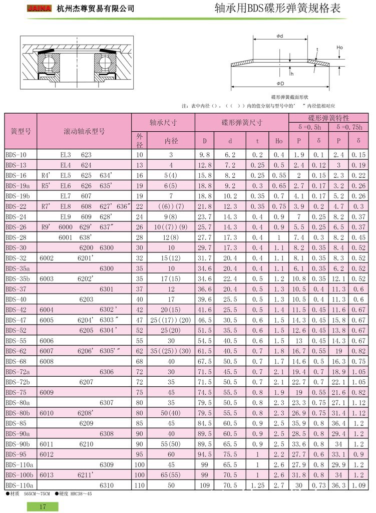 BDS轴承用碟形弹簧,外径从9.8mm至420mm,与轴承型号一一对应,规格齐全,被广泛用于精密传动的轴承预压,如广泛用于木工机械的主轴总成,机床,纺织机械等。