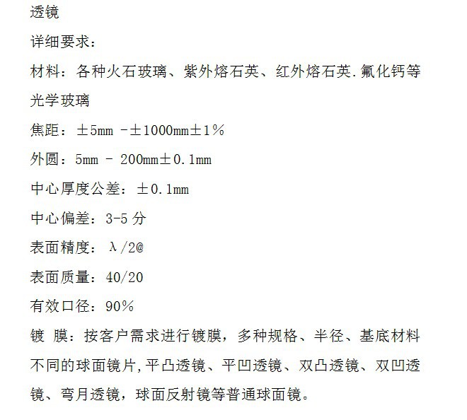 材料:各种火石玻璃、紫外熔石英、红外熔石英.氟化钙等光学玻璃焦距:±5mm -±1000mm±1%