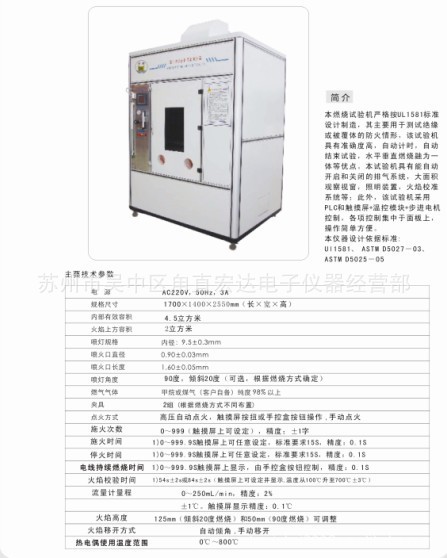 燃烧试验设备:灼热丝试验机、漏电起痕试验机、针焰试验机、UL电线电缆燃烧试验机、塑料燃烧试验机。