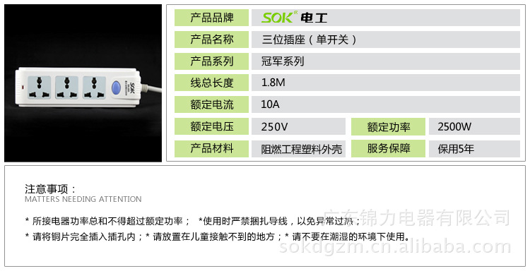 公司专营SOK移动排插批发,开关插座面板,墙壁开关插座,开关插座底盒,防水开关插座,移动排插,工程开关插座,电工照明,节能灯电视电话插等。SOK移动排插批发等产品率先通过ISO9001-2000国际质量管理体系认证、ISO14001国际环境管理体系认证、3C认证、欧洲CE认证等多项权威认证。并已被广东科委认定为“广东省高新技术企业”。是一家专业生产销售电工,照明的厂家。