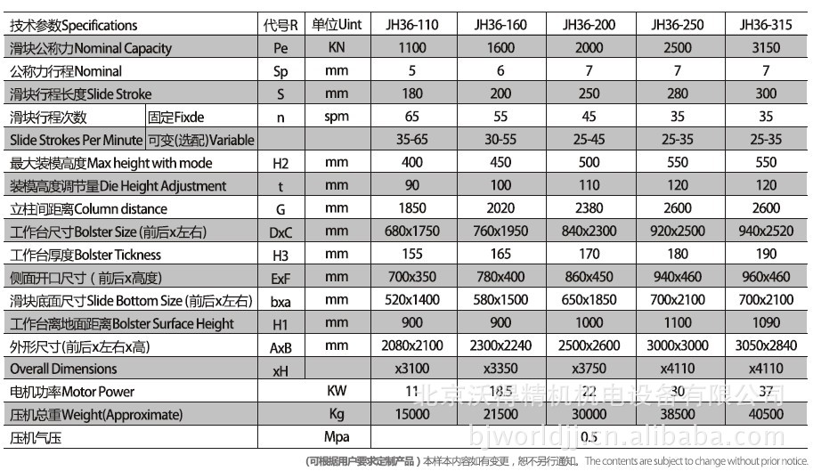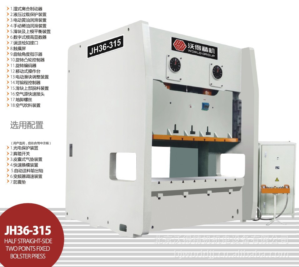 JH36的性能特点 ·钢板焊接机身,将传统的C形靠口改为D形开口,具有高强度、高刚度、高精度;·采用双曲轴逆向传动,提高了机床抗偏载能力; ·滑块采用六面矩形导轨。导向好,精度高; ·采用高扭矩摩擦离合器,工作稳定,噪音小,使用寿命长,安全可靠; ·电动调模,读数精确到0.1MM; ·采用集中润滑,具有循环指示装置; ·可配装各类自动化周边设备,大大地提高生产率;可选配气垫和光电保护装置;·进口电气元器件,提高机床使用性能.