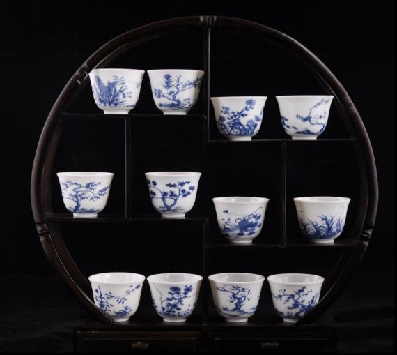 “十二月花卉纹杯”是清代康熙、雍正官窑瓷器中的品名。“十二月花卉纹杯”,12件为一套,惯称“十二月花神杯”。它们一杯一花,腹壁一面绘画,另一面题诗,诗句出自唐诗。此青花套杯胎薄如纸,唇源如线。遥想康熙大帝当年,手执花神杯,举杯邀月,对酒当歌的胜景,难怪他要发出“向天再借五百年”的慷慨豪言了。