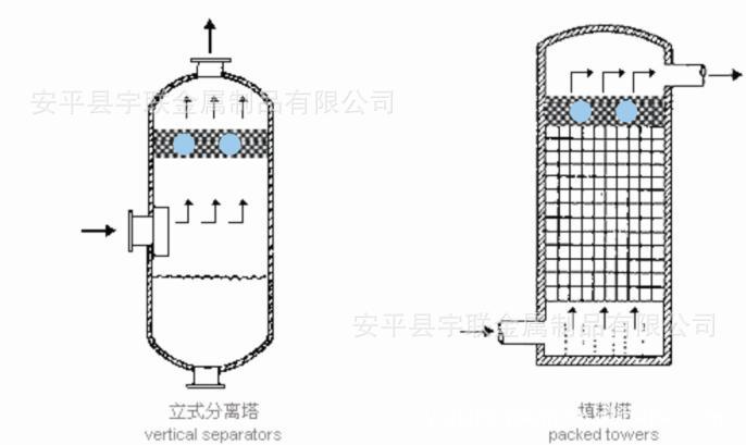 丝网除沫器(除雾器)用于分离塔中气体夹带的液滴,以保证有传质效率,降低有价值的物料损失和改善塔后压缩机的操作,一般多在塔顶设置丝网除沫器。可有效去除3--5um的雾滴,塔盘间若设置除沫器,不仅可保证塔盘的传质效率,还可以减小板间距。所以丝网除沫器主要用于气液分离。亦可为空气过滤器用于气体分离。此外,丝网还可作为仪表工业中各类仪表的缓冲器,以防止电波干扰的电子屏蔽器等。