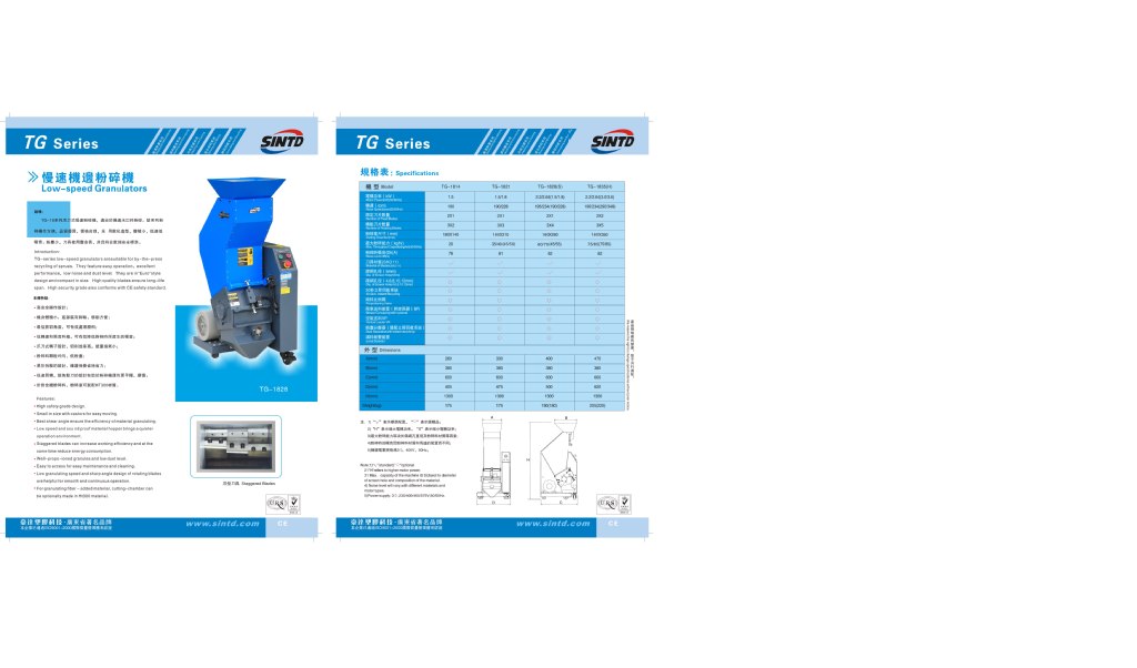 TG-18系列爪子式慢速粉碎机,适于机边水口料粉机。该系列粉碎机操作方便,品质优异,价格合理,采用欧化造型,体积小,低速低噪声;粉尘少,刀具使用命长,并且符合欧洲标准