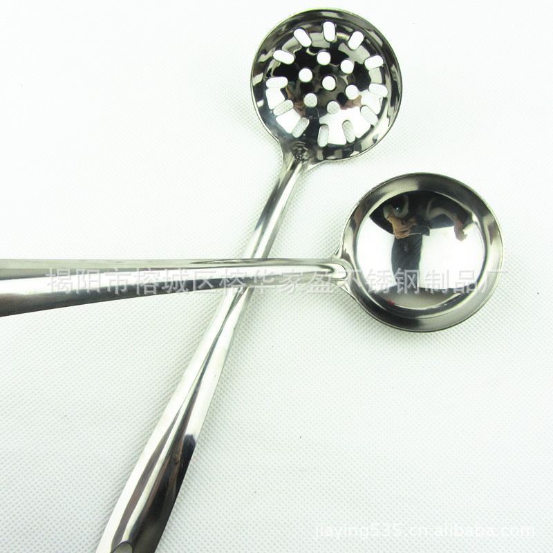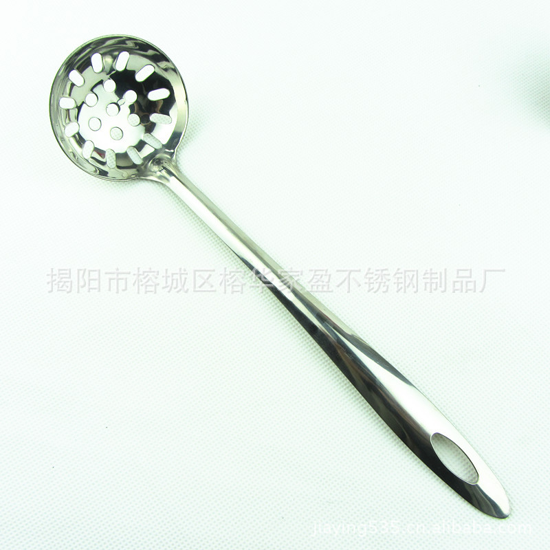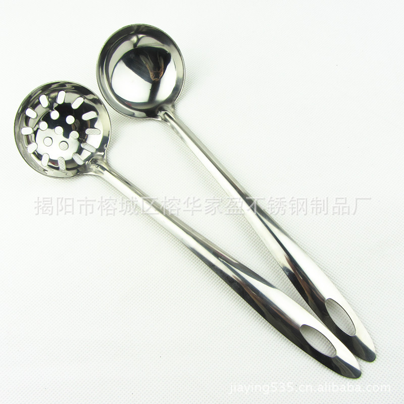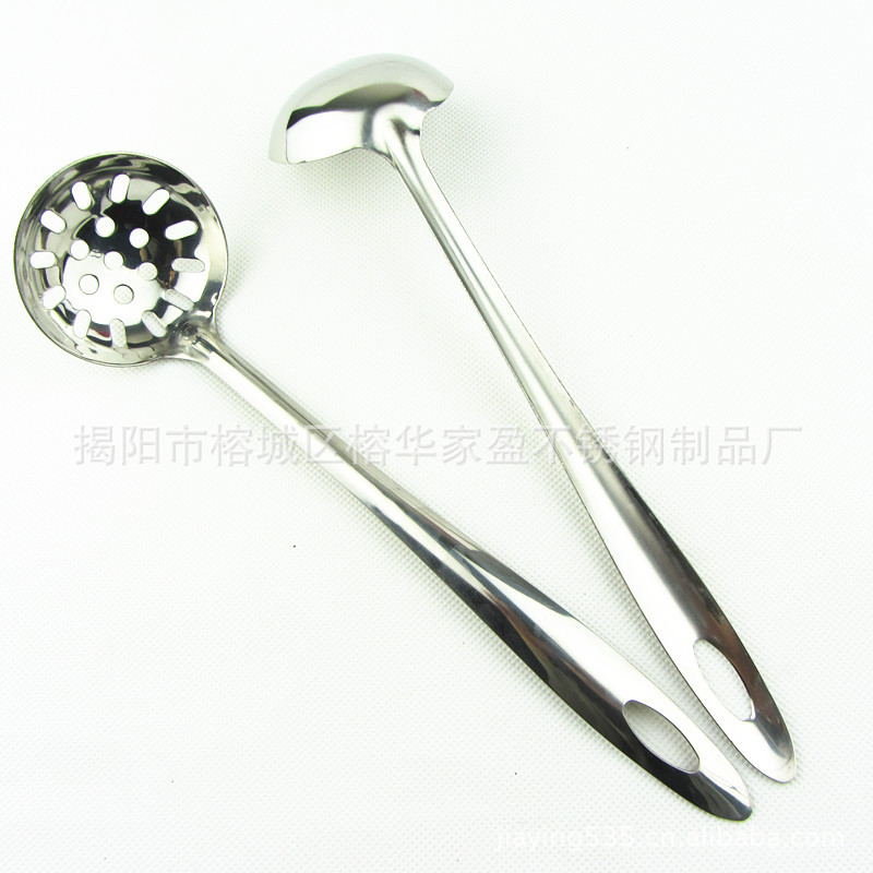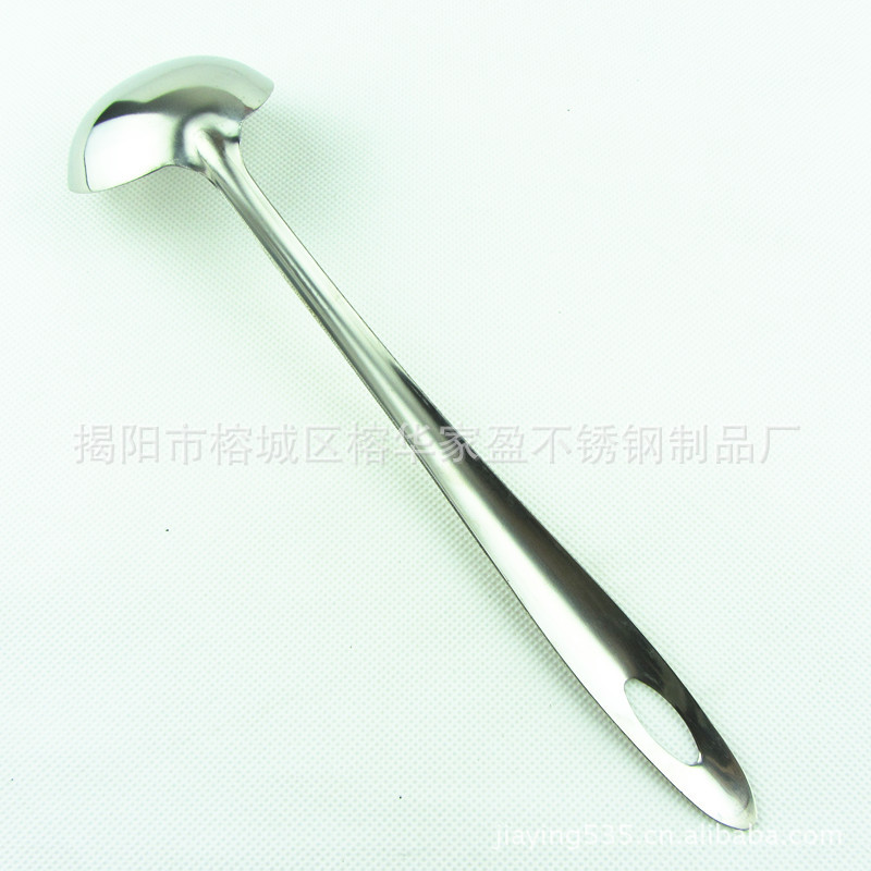 1、揭阳家盈厂华盈牌光身尖尾6公分铲勺厨具套装 此款勺采用高档进口纯不锈钢无磁原材料精制而成,严格质量检验。可散装批发,高档布轮镜面抛光,此套厨具采用一体成型技术,无任何接口,边缘圆滑整体手感舒适,还有镜子般的亮度。