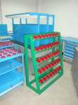 刀具架适用于加工车间、维修车间等场合,可分类放置刀具,并可灵活移动方便取用,多边成型的前后侧板上有模数化的人字孔,可将刀具座挂板按水平或15、30倾斜放置,方便多种刀具的存放。刀具架可以配高强度脚轮,车前为两个定向轮,车后为两个万向带 刹车轮,推行平稳,方向性好,刹车固定后不会滑动。刀具车,一般分为柜式和抽屉式两种,刀具架是存放、搬运刀具的装备,这里以‘现代货架厂’生产的HY-HSK系列型号为例,此类刀具车可存BT30、BT40、BT50、HSK63、HSK100等多种型号的刀具。多边成型的整体式侧板上有模数化的人字孔,可将刀座按水平或15°、30°倾斜放置,方便多种刀具的存取。HY-HSK系列可根据需要选择带抽屉或不带抽屉的刀具车,专业的技术保证了刀具架。