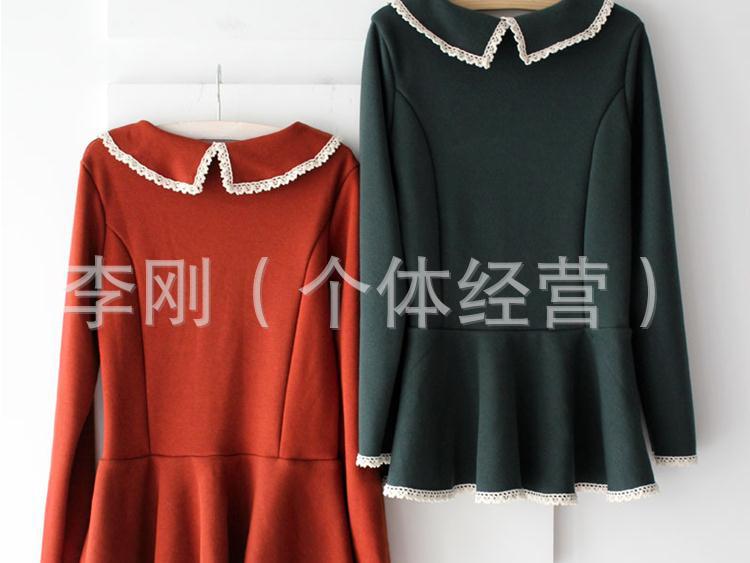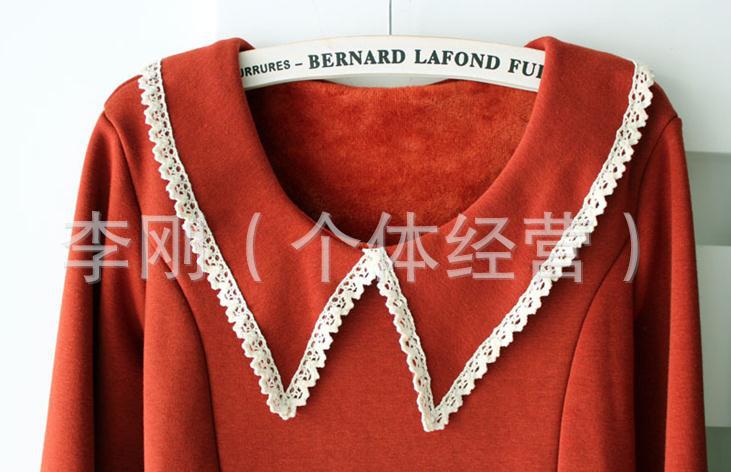 款型非常漂亮 领口袖口底边的蕾丝边精美可爱 娃娃领大底摆公主造型 做工精美面料是定织定染的加厚高弹保暖绒棉针织材质克重非常足 保暖性很好 质感绝非一般差料可比哦版型修身显瘦 让您保暖同时拒绝臃肿和平淡颜色非常正:砖红 墨绿 杏黄 藏青 黑色均码 参考尺寸胸围84-100 肩宽36-42 腰围78-92 衣长65 袖长58 底摆90x2