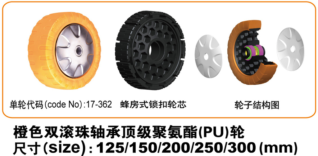 范围:适合多种地面上使用,广泛的运用于各种行业。使用温度为-35~80℃,轮子表面邵氏硬度为≥100A。