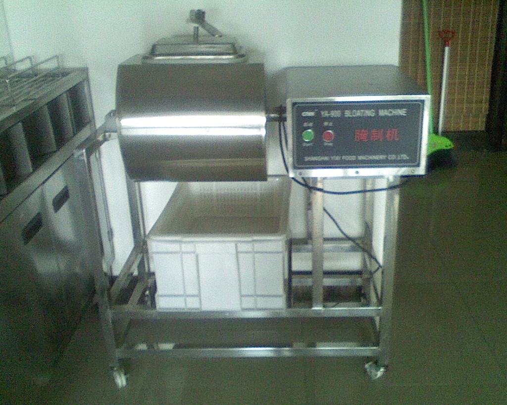 该机是利用了机械式滚筒原理,让被腌制的肉互相摩擦,加快调味料渗入肉品的速度。该机现在是超级市场、快餐店、和小食品店争先获取的宠儿。 本公司是专业生产腌制机的厂家,该产品款式新颖独特、结构合理 、操作方便 体积小、外形美观 、转速均匀、输出力矩大、容量大 、 密封性好、腌制速度快(时间可自己调节控制,让客户按照自己的配方,调整腌制时间,最长可以设置为30分钟,出厂设置为15分钟,适合大部分客户使用的腌料) 省电等特点,可用它腌制各种肉类以及其他食品,腌制出的食品不变形。质量保证,价格优惠。全不锈钢结构,滚筒带防漏胶边,带四个轮子,方便移动。电气部分具有防水装置。每次产量为5-10公斤鸡翅。