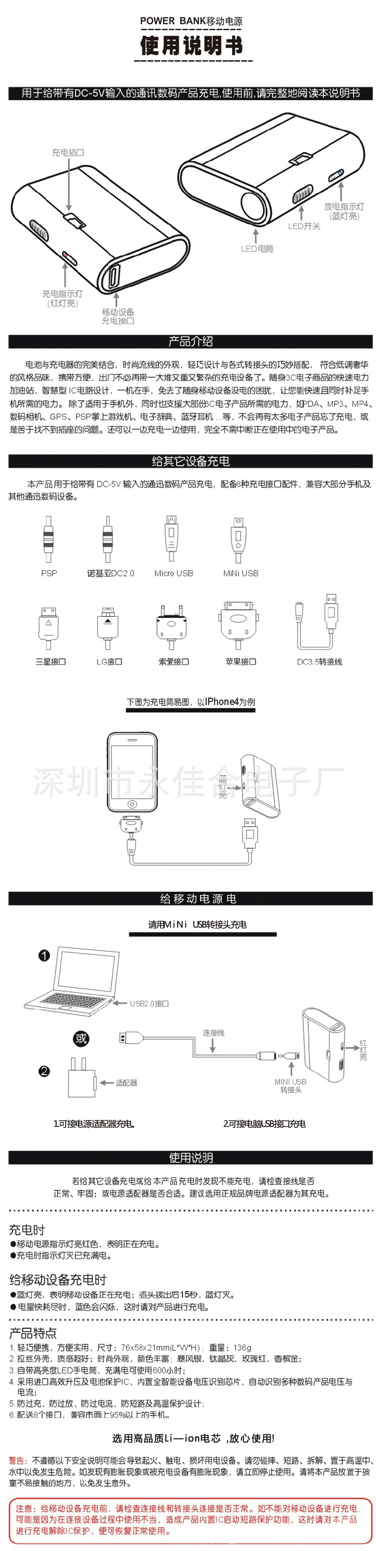 2、兼容性强、性价比高:可随时随地为市场各种品牌的手机、MP3、MP4等多种便携式数码产品供电或充电,一机多用,省钱省时。
