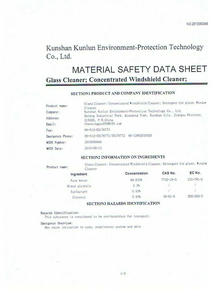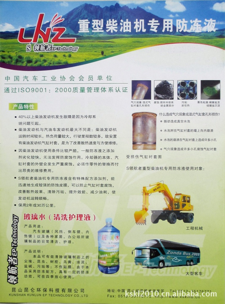 昆山昆仑环保科技有限公司是一家致力于汽车环保养护用品的高科技企业,拥有现代化办公及生产厂房;拥有四条全自动灌装生产线,下属实验室拥有日本原装冰点浓度仪、德国PH仪等进口检测仪器。产品符合:SH0521、日本JISK2234、美国ASTMD3306标准。