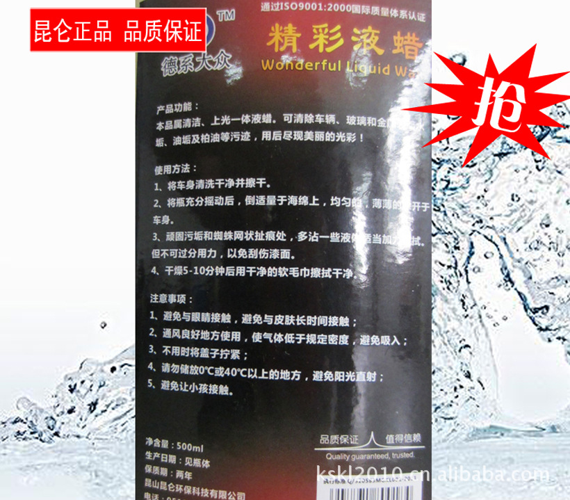 昆仑领航者精彩液蜡属于清洁上光一体液蜡,可清除车辆、玻璃和金属表面水垢、油垢及柏油等污迹,用后尽显美丽色彩。