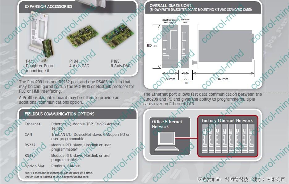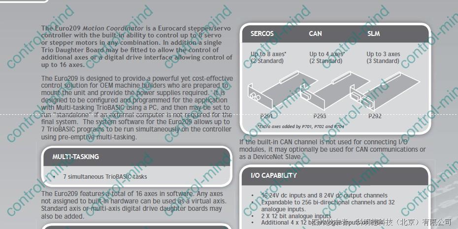 Euro209是一款欧式结构的独立运动控制器,该控制器结合子板可以控制1到9个轴的伺服或步进,或者是二者的任意结合。包括软件轴可以对最多16轴进行控制。Euro209是为OEM设备生产商提供的有一功能强大,并且非常经济的运动和控制器。和其他控制器一样,Euro209也是通过PC用TRIO BASIC进行运动控制程序的编写。程序调试完成后,如果系统中不需要计算机的话,控制器可以脱离计算机进行独立工作。所有TRIO 运动控制器都是多任务的。Euro209最多可以同时运行7个程序。复杂的运动曲线,可以很容易的编程实现,而且可以链接到主轴编码器输入上,实现同步控制。