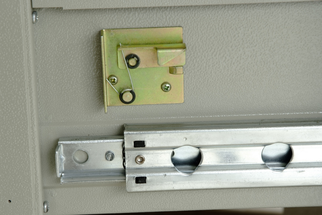 联锁装置:用户如不需要每个抽屉均配置独立联锁,可开启联锁功能,由一把锁控制全部抽屉。我公司产品出品时已经启用联锁装置。联锁装置位于每节抽屉围板右侧,图1为顶端抽屉联锁装置锁购,图2为联锁开启,图3为联锁关闭。