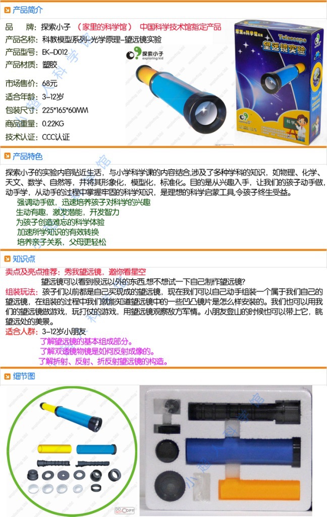 探索小子儿童科学实验玩具科普电学益智DIY玩具/望远镜实验