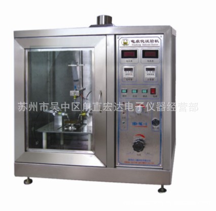 漏电起痕试验装置是按GB4207、IEC60112等标准要求设计制造的专用检测仪器,适用于对电工电子产品、家用电器的固体绝缘材料及其产品模拟在潮湿条件下相比漏电起痕指数和耐漏电起痕指数的测定,具有简便、准确、可靠、实用等特点。 用于照明设备、低压电器、家用电器、机床电器、电机、电动工具、电子仪器、电工仪表、信息技术设备的研究、生产和质检部门,也适用于绝缘材料、工程塑料、电气连接件、辅件行业等模拟仿真试验。 实验原理:漏电起痕试验是在固体绝缘材料表面上,在规定尺寸(2mm×5mm) 的铂电极之间,-施加某一电压并定时(30s)定高度(35mm)滴下规定液滴体积的导电液体(0.1%NH 4CL),用以评价固体绝缘材料表面在电场和潮湿或污染介质联合作用下的耐漏电性能,测定其相比电痕化指数(CT1) 和耐电痕化指数(PT1) 。