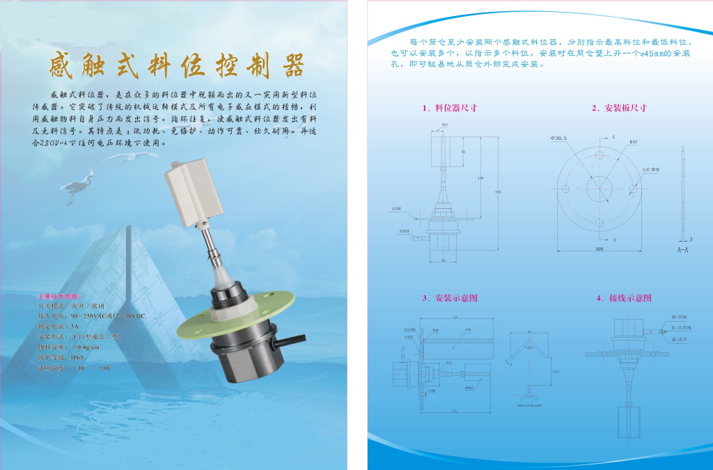 感触式料位器,是在众多的料位器中脱颖而出的又一实用新型料位传感器.它突破了传统的机械运转模式及所有电子感应模式桎楷,利用感触物料自身压力而发出信号.循环往复,使感触式料位器发出有料及无料信号.其特点是:低功能.免维护.运作可靠.经久耐用.并适合250V以下任何电压环境使用.