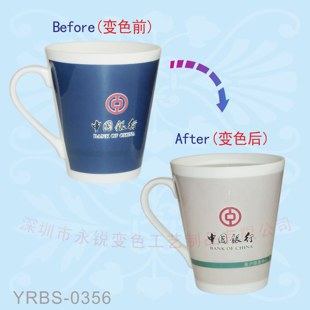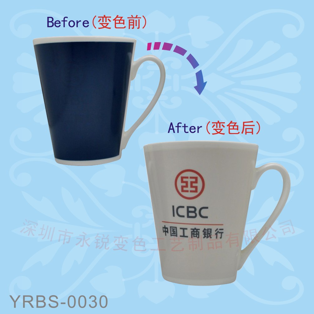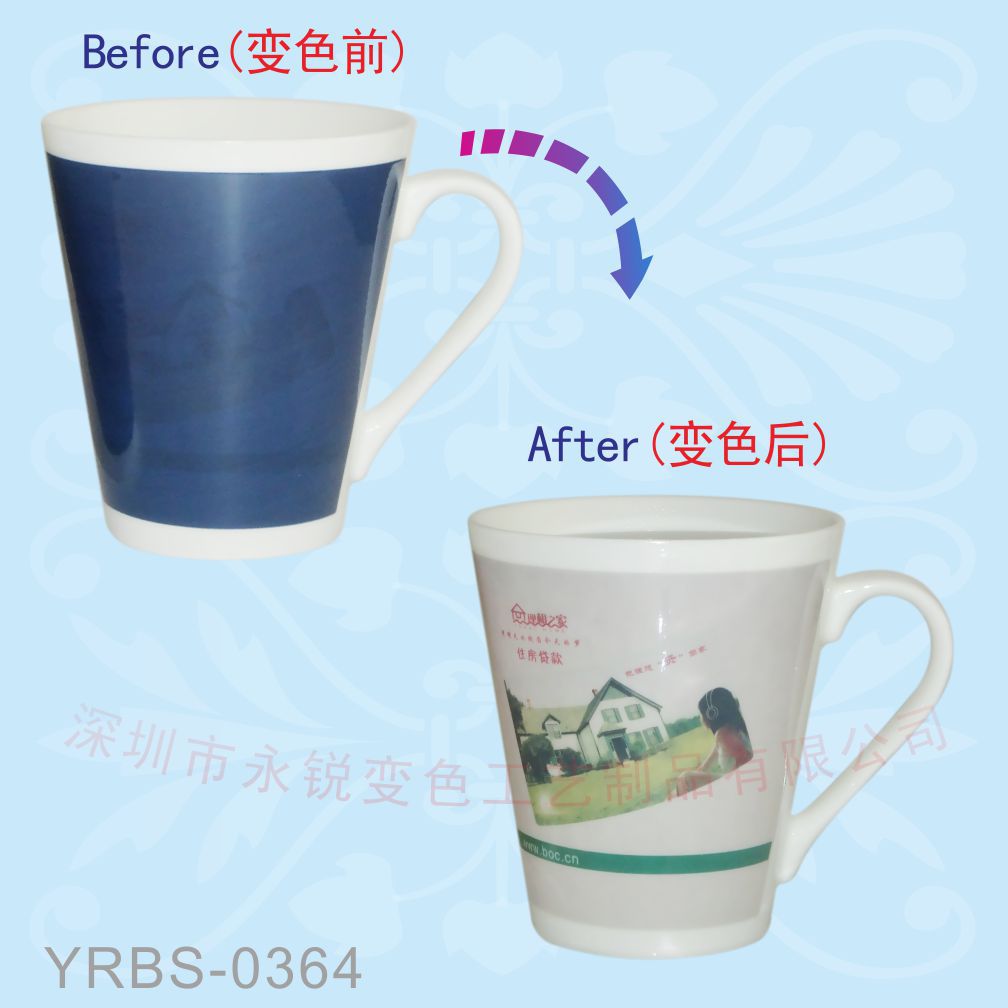 变色杯所用的变色油墨是以生物材料合成的无毒、无害、无污染的一种油墨。变色产品的显著特点是通过感受不同的温度从而发生颜色的变化。变色杯就是从有色变为无色,温度变化时,有色退至无色,一旦温度恢复,变色杯也会恢复为原来的变色油墨颜色,其印刷在变色油墨下的图案就可以在颜色的变幻中显示出神奇的效果!