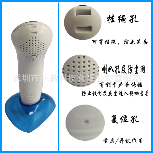 [智乐教点读笔]无毒无味,内置锂离子电池,安全、高效、环保、内置笔头,无外置易脱零件,外型圆滑,完全符合儿童的人体工学特点,外壳使用环保的ABS及抗紫外线材料做成,所发声音为机械波,音量可自动调节,严格控制在孩子的正常视听范围。