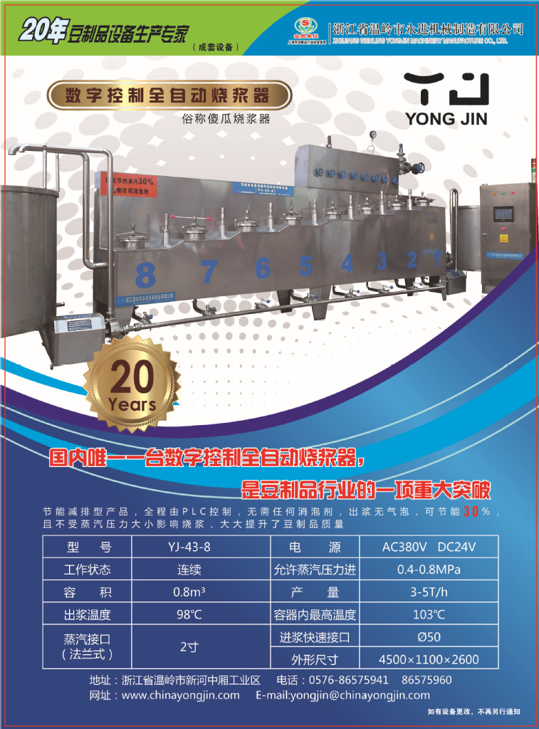 温岭市永进机械制造有限公司,是中国食品工业协会大豆专业委员会常务理事单位,上海豆制品行业协会会员单位,上海市豆制品行业先进领先单位,中国豆制品设备优秀制造企业,是国内唯一一家豆制品设备自营出口企业。本公司以诚信、务实、创新、领先的理念在国内外享有较高知名度,“买永进设备,放心使用”这是用户对本公司的高度评价。