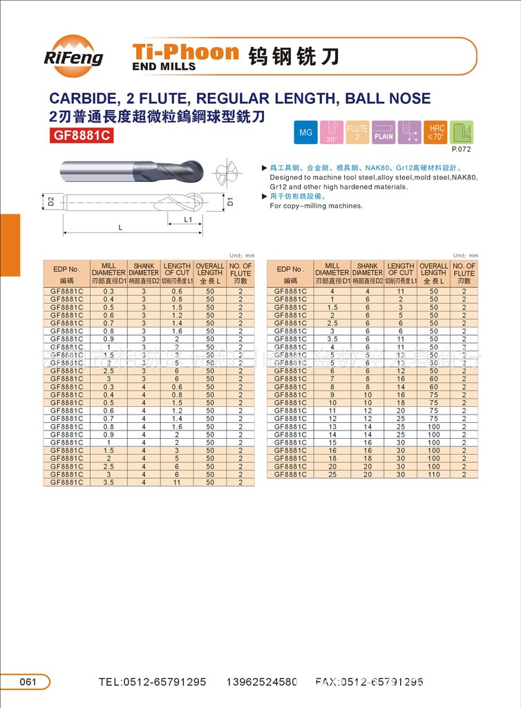 苏州日峰数控刀具为韩国YG钨钢铣刀的华东区总代理。有超微粒和极细超微粒两种,分别可加工HRC50度以下和HRC60度以下,适合普通铣床和数控加工中心,适用于普通钢,模具钢,淬火钢,铸铁,不锈钢,铜,铝,钛合金,镍合金等,用途广范。所有母材均为德国进口,德国ALTICN涂层技术,韩国磨制,质量稳定,耐磨性好,性价比极高。规格齐全,货源充足,可接受非标定制,欢迎来电或来我司莅临指导。薛峰:65791295,13962524580