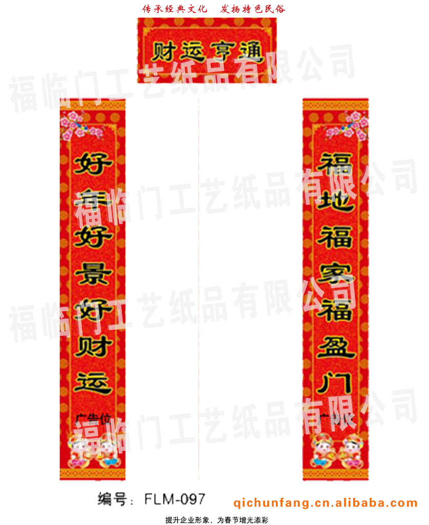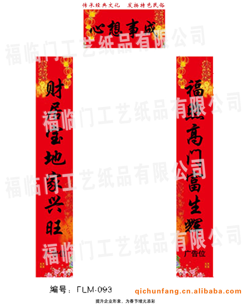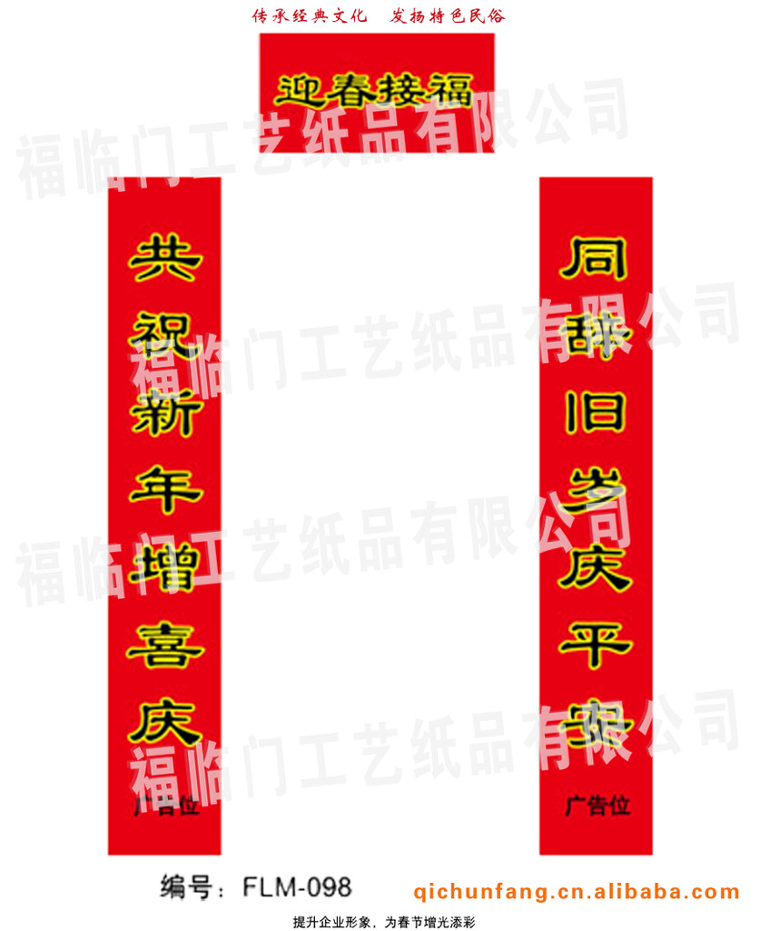 福临门工艺纸品有限公司,是一家专业生产、加工定做各种高档印刷春联、烫金春联、年画、年利、福字、喜笺、窗花、手提袋、红包等纸品的厂家。10余年的发展,公司已经成为国内同行业极具影响力的大型企业。