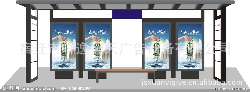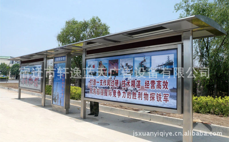 不锈钢板或镀锌板是候车亭最主要的材料,也有采用铝型材的,但比较少见。其他主要材料还有PC耐力板,用在灯箱两面,就是广告画面外面透明的那层板;铝塑板,用在顶棚的下面,就是抬头看到的那部分;镀锌板,一般用在顶棚上面和灯箱的主框。