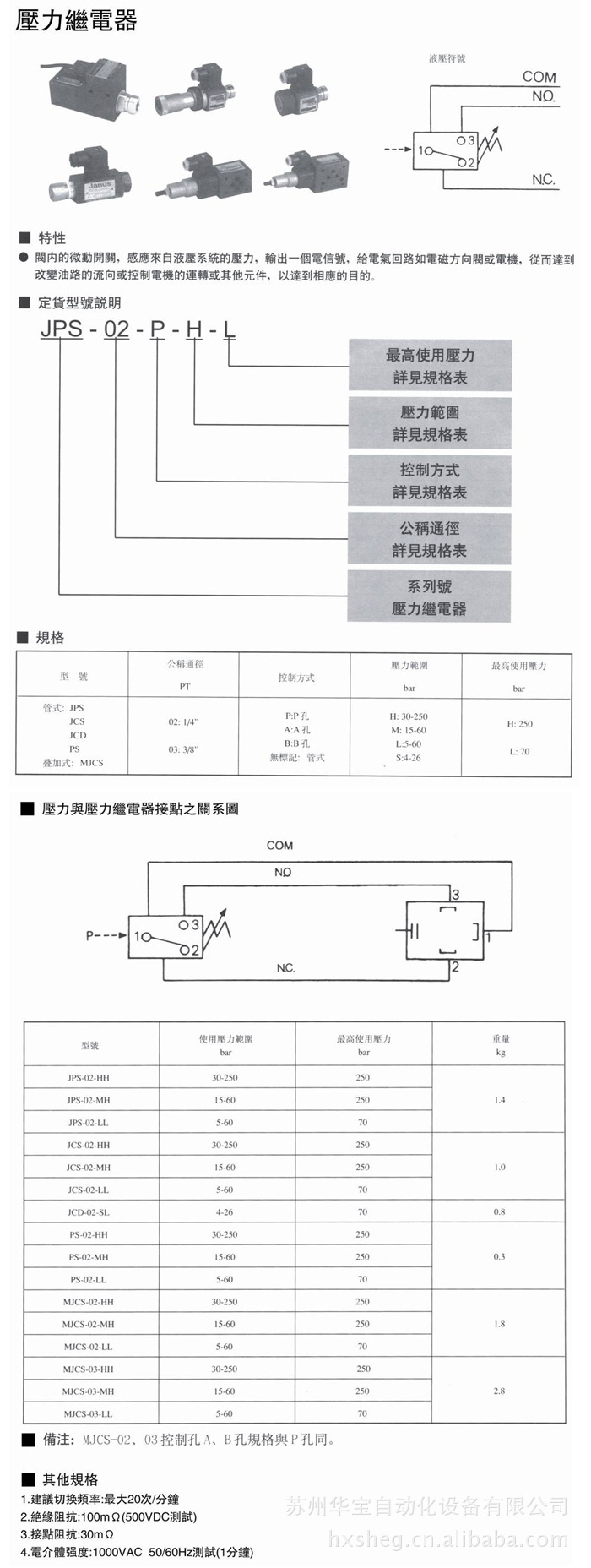 压力继电器JPS内藏微动开关,感应来自液压系统的压力,传达电气信号给电磁换向阀或电气马达,使其改变切换方向或警告关闭油路,以达到系统安全的效果。