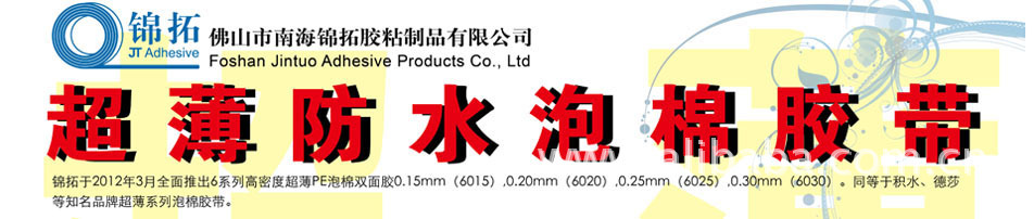 锦拓于2012年3月全面推出6系列高密度超薄防水PE泡棉双面胶0.15mm(6015),0.20mm(6020),0.25mm(6025),0.30mm(6030)。同等于积水、德莎等知名品牌超薄系列防水泡棉胶带。