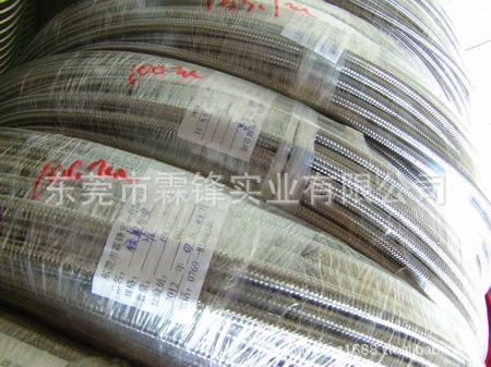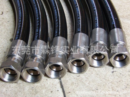适用于工业气体设备做高压软管。内四氟(铁氟龙)为日本大金、美国杜邦。外编织网套为304不锈钢丝,可单层、双层及多层。接头为铜接头HPb59-1或不锈钢OCr18Ni9,长度根据用户需要确定。可根据用户需要外包弹簧,弹簧为碳钢镀锌、镀铬、镀镍或304不锈钢。