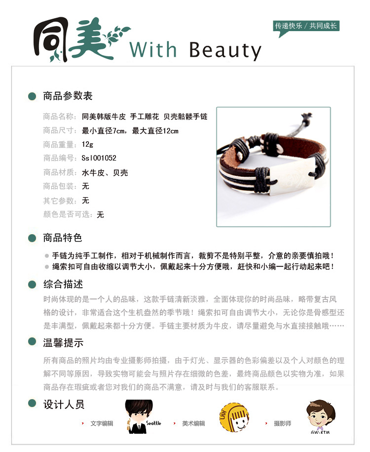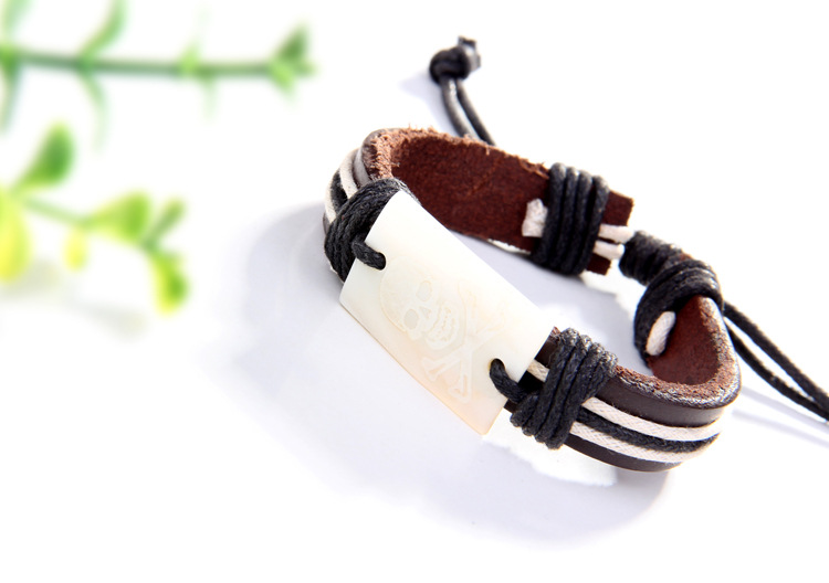 Ssl001052 同美韩版贝壳椰子壳系列 牛皮手工雕花 贝壳骷髅手链