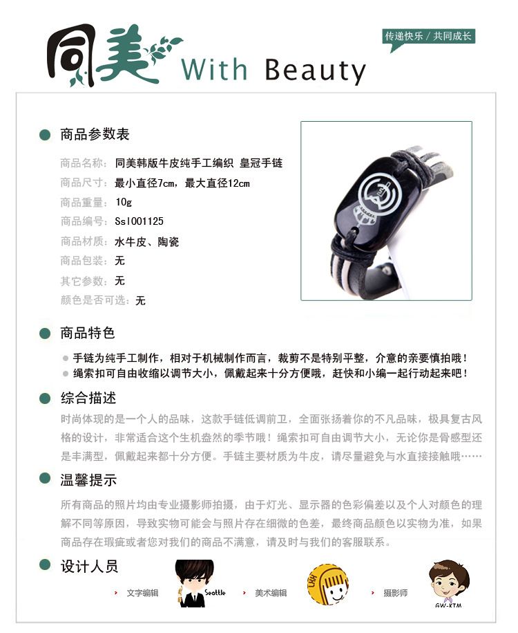 Ssl001125 同美韩版陶瓷系列 牛皮纯手工编织 皇冠手链 定做
