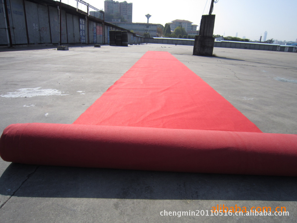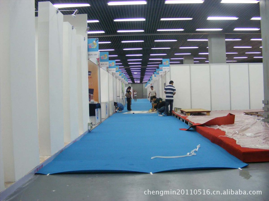 展览地毯介绍展览地毯又称针刺无纺地毯。它是由合成纤维通过针刺或编织而成的。成品为布状,一般宽度为1-4米,长度为30-50米。1:展览地毯的用料分:涤纶短纤维和丙纶短纤维。2:展览地毯的颜色分:红色,蓝色,绿色,黄色,紫色,棕色以及各种混合色。纤维的颜色决定了地毯的成色效果。3:展览地毯的品种分:平面、条纹、覆膜、拉绒、阻燃等。4:展览地毯的用途:展览会、展览馆、庆典活动、开幕式、婚庆等5:展览地毯的质量要求是:不起球,不掉毛,平整度好,硬度好。展览地毯是短纤维经过不同的设备和工艺铺排成网状,在经过针刺等工艺让不同的纤维相互交织在一起,相互缠结固着使织物规格化,让织物柔软、丰满、厚实、硬挺,以达到不同的厚度满足使用要求。针刺成型的坯布再经过背面上胶,烘干定型,切边,成卷包装。2:展览地毯作用1审美角度:美化、装饰环境:由于地毯的颜色不同室内铺上地毯,能给人有一个良好的心境,人处于居室之中 有舒畅,轻松的感觉。 2安装铺设容易:适宜结合家居等产品进行配合搭配,起到不单调,可以经常更新室内环境的风 格,且容易更换。 3吸音和隔音:地毯与其他铺地材料相比具有更优良的吸音隔音效果。 4保暖 :人们踩在硬质地面上有一层冰凉的感觉尤其在冬天较为显著。 5安全 :在地毯上行走,不易打滑跌倒,即使跌倒也不易受伤。 6净化室内空气:空气中的尘埃及细菌会被地毯所吸附,从而减少尘阿病菌的流动,起到净化室内空气,提高室内空气质量的效果。 7从古到今,地毯亦被人们视为是最高档,最理想的地面铺设材料,是生活水平,档次,视为提高的表现。地毯的用途:展览会、展览馆、庆典礼仪活动、开幕式、演艺活动等公共场所。3:展览地毯价格展览地毯基本分为平面展览地毯,覆膜展览地毯,双面背胶地毯,阻燃地毯,普通展览地毯由于是一次性的地毯,档次较低,所以价格较低。