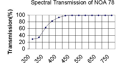 NOA78采用紫外光固化,对波长320—400nm的紫外光和波长400—450nm的可见光有最好的吸收。峰值吸收波长是325、365、405nm。完全固化的推荐能量为3.5焦耳/平方厘米的长波紫外光或7焦耳/平方厘米的可见光。