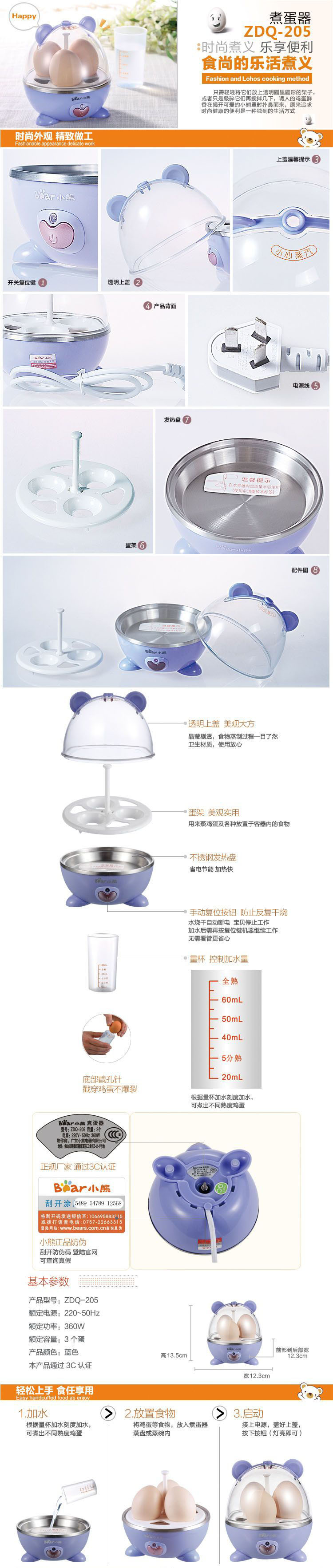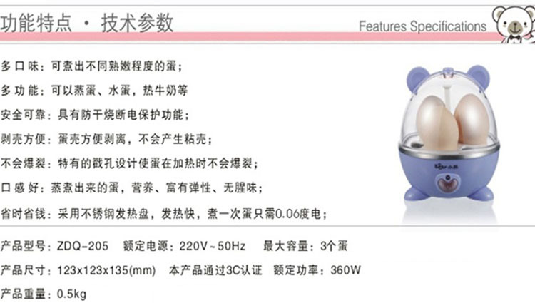 Bear/小熊 煮蛋器 ZDQ-205 蒸蛋器 3个蛋 防干烧 自动断电 正品