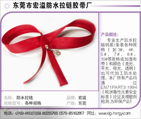 该产品可通过各项性能测试,公司创建于2000年防水拉链码装描述:1材料:(1)尼龙布带:采用特殊工艺缝合而成,保持布带中缝细密,有回弹性,防止水从缝隙中渗入.(2)PVC\PU膜:采用添加环保增塑剂柠檬酸酯PVC\PU膜(哑光,亮光)(3).粘结剂:采用高性能纺织品专用热熔胶. 2工艺:引进国内先进的热风贴合技术的全套设备. 3性能:(1)贴合牢度:TPU膜与布带贴合牢度达到(剥离强度65/25mm )标准:GB/T2790—1995(2)水洗,干洗:60度水温30次.(只加入洗衣粉不添加任何化学药品)(3)平拉次数:大于3000次(4)低温;高温:零下10度,高温110度4品种:包括(哑光,亮光),(3号,5号,8号,10号)等防水拉链规格。5用途:应用于服装,箱包,帐篷,雨衣,防水鞋等领域,此款防水拉链适用于服装的无缝贴合技术上。防水拉链使用注意事项:1熨烫:熨烫很有可能成为防水膜脱落的原因,请尽量避免熨烫。如需熨烫请放上薄布后操作。2洗涤:洗涤时为了避免损伤防水膜,必须把防水拉链拉好后洗涤,晾干时请自然晾干。3干洗:由于干洗化学药品的品种太多,防水拉链的干洗条件很有可能跟衣物面料的干洗条件不同,请所有使用本公司防水拉链的用户在使用本公司防水拉链前,请亲自确认后使用。4:颜色:请勿将产品放置于阳光下直射,否则将产生产品颜色变淡,变黄等异状.由于聚氨酯的特性,拉链的颜色可能与胶面的颜色变深一点. 5成品衣物类包装:为防止在运输途中拉链上的颜色扩散到衣物内部面料,请在包装时衣物和衣物之间、衣物内部使用包装用薄纸。6其他:使用本公司防水拉链的所有客户,请在使用之前事先做个实验确认是否符合自家公司使用条件。用途:防护服类:宇航服、潜水服、用于潜水艇的逃生服、减压服、危险防止服、污染防止服、防辐射服、用于水上滑艇的简易服等;密封套类:飞机引擎、发电装置、电器器具、机械工具、飞机、降落伞、壳物仓、生物、用于运输的集装箱;其他:需要保持气密状态的构造物、水上娱乐气球、救生筏、救生装备、船舶备件、舱口盖、污染物废弃袋、隔离床、气体泄露防止门、帐篷、气垫船围裙部分、热气球、屋檐帆等