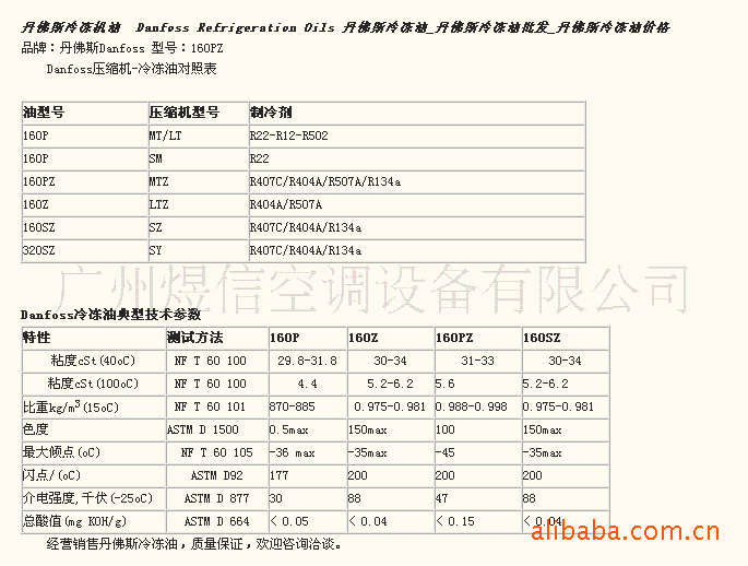 油型号 压缩机型号 制冷剂 160P MT/LT R22-R12-R502 160P SM R22 160PZ MTZ R407C/R404A/R507A/R134a 160Z LTZ R404A/R507A 160SZ SZ R407C/R404A/R134a 320SZ SY R407C/R404A/R134a Danfoss冷冻油典型技术参数 特性 测试方法 160P 160Z 160PZ 160SZ 粘度cSt(40oC) NF T 60 100 29.8-31.8 30-34 31-33 30-34 粘度cSt(100oC) NF T 60 100 4.4 5.2-6.2 5.6 5.2-6.2 比重kg/m3 (15oC) NF T 60 101 870-885 0.975-0.981 0.988-0.998 0.975-0.981 色度 ASTM D 1500 0.5max 150max 100 150max 最大倾点(oC) NF T 60 105 -36 max -35max -45 -35max 闪点/(oC) ASTM D92 177 200 200 200 介电强度,千伏(-25oC) ASTM D 877 30 88 47 88 总酸值(mg KOH/g) ASTM D 664 < 0.05 < 0.04 < 0.15 < 0.04