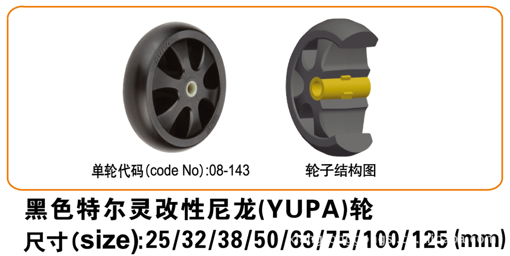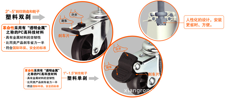 支架:双波盘双轨道圆弧形的设计,加大支架偏心度,转向更灵活。轮子:采用改性尼龙材料一次注塑成型,具有抗冲击、耐重等功能,比平面设计省力30%;特尔灵的结构,具有防水、防潮湿。外观:具力学原理拥有汽车轮一样动感的黑色轮子配镀锌支架,更显合理。