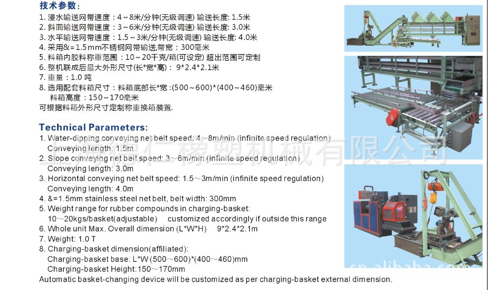 同时,满箱的物料箱被自动输送到辊筒输送线上,由操作人员处理。浸水输送装置可使胶料冷却并防止胶料碎屑相互污染。水箱内有余料箱,方便取出清理。当冷却输送机上午胶料时,空运行5分钟后,即自动停机。(LSS-Q800 清理&自动称量水冷式冷却输送机)