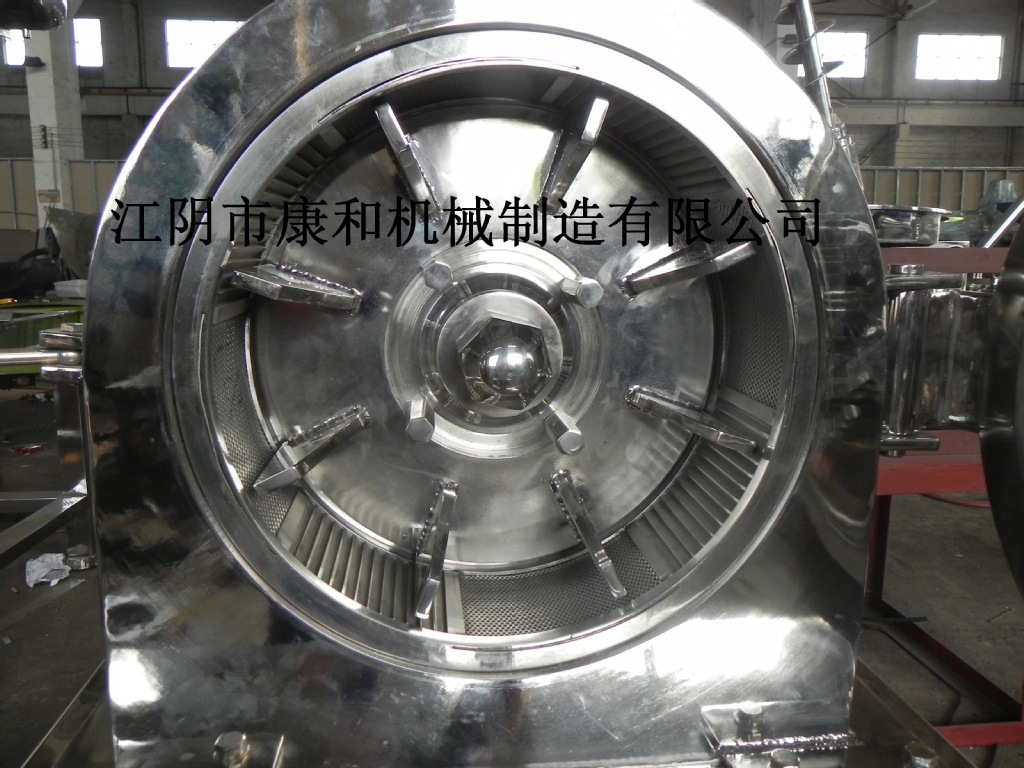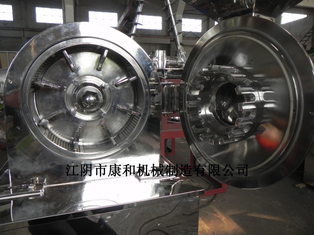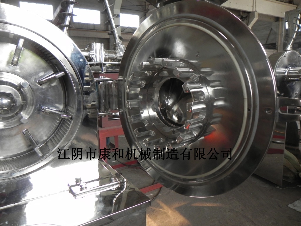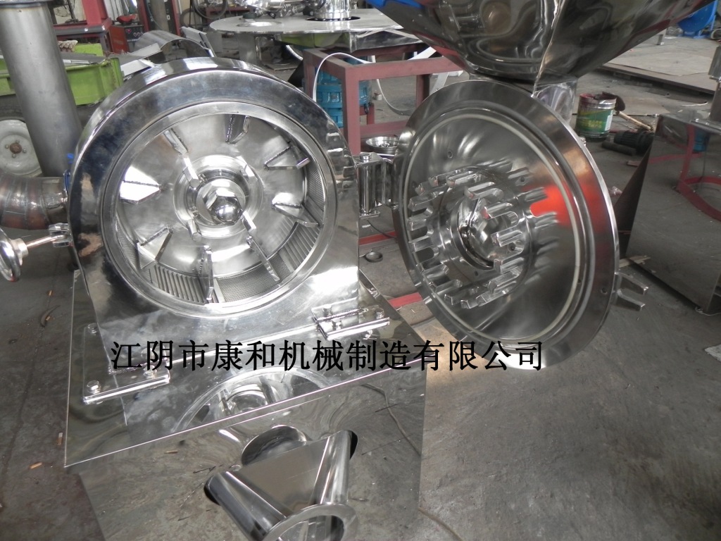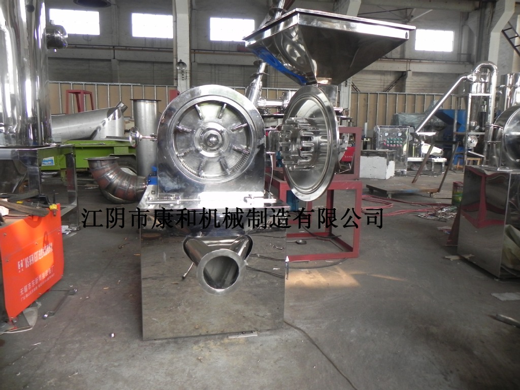 FL-系列风冷粉碎机 一.主要适用于制药、化工、食品(例:生姜、辣椒、胡椒、油麦、大豆、白糖|八角、桂皮)等中低硬度物料的粉碎加工,细度在10-120目之间调节,具有产量高、粒度细、噪声低、能耗低、维修简单、安装方便等优点,特别适用于油性、粘性、热敏性、纤维性等低硬度物料的粉碎加工。 二、结构与工作原理: 1、结构:FL-风冷粉碎机主要有机壳、机门、涡轮、主轴、筛网、皮带轮及电动机等零部件组成。 2、工作原理: 粉碎机动转时,电机带动主轴及刀盘高速旋转。刀盘与筛网圈上的磨块组成破碎、研磨副,当物料从加料斗中进入机腔内,物料在刀盘的旋转气流中紧密地摩擦和强烈地冲击到刀盘的叶片内侧上,并在叶片与磨块之间的缝隙中再次研磨。在粉碎物料的同时,刀盘吸入大量空气,这些气流起到了冷却机器、研磨物料及传送细料的作用。物料粉碎的细度取决于物料的性质和筛网的尺寸,以及物料和空气的通过量。 粉碎机的轴承部件装有特制的迷宫密封,可以有效地阻止粉尘进入轴承腔,从而延长了轴承的使用寿命。机门内装有硅橡胶密封圈,无粉尘泄露而污染操作环境。 三、特点: 1、粉碎能力强,能耗低,产品相对细度较小。 2、粉碎空间大,刀盘运转时产生的高强风压,不仅能提高生产能力,降低过粉碎现象,并能有效地避免物料在粉碎过程中的产生对筛网的沉积和堵塞现象。 3、由于强化了剪切,故而对于纤维性物料的粉碎能力比一般的设备高。 4、筛网的安装便利,定位可靠,均采用插入式。便用寿命相对于环筛形式高了很多。 5、设计内藏式电机,使机器的重心降低,有效地降低了设备噪音 四、技术参数 项目 | FL-250 | FL-350 | FL-600 | 生产能力(kg/h) | 30-300 | 40-800 | 100-1600 | 进料粒度(mm) | 5 | 5 | 5 | 粉碎细度(目) | 30-120 | 30-120 | 30-120 | 重量(kg) | 285 | 350 | 650 | 主轴转速(r/min) | 4200 | 3800 | 2900 | 总功率(kw) | 4/5.5 | 7.5/11 | 18.5/22 | 外形尺寸(L*b*hmm) | 550*420*1400 | 770*750*1500 | 1200*1000*2250 |