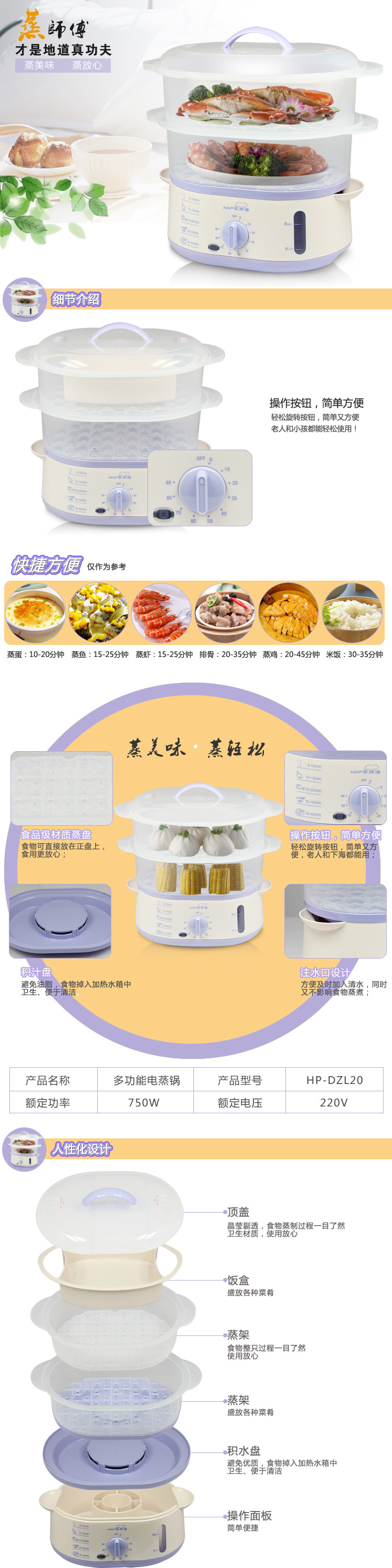 7、电蒸锅采用可移动蒸架和可移动式蒸格层,清洗非常方便。