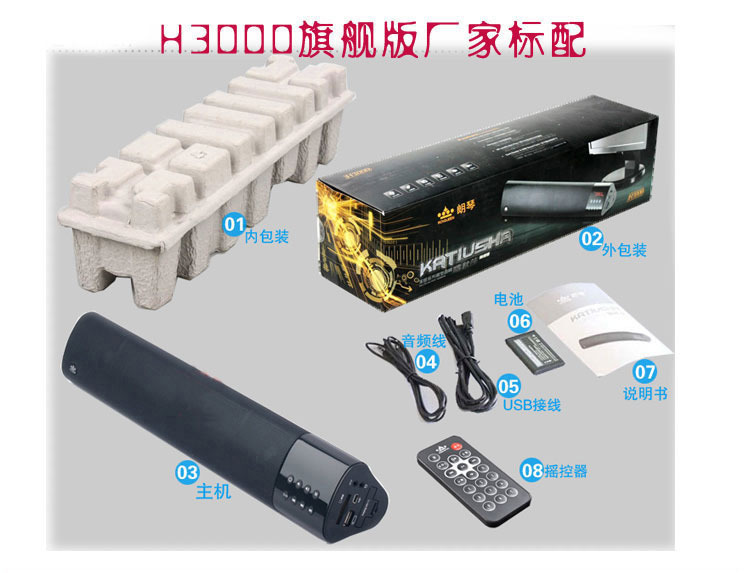 随机附件:USB连线、 音频线、锂电池、遥控器、保修卡、说明书