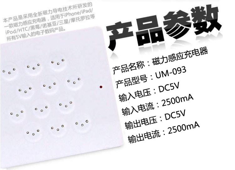 本产品是采用全新磁力导电技术所研发的一款磁力感应充电器,适用于iPhone/iPad/iPod/HTC/黑莓/诺基亚/三星/摩托罗拉等所有5V输入的电子数码产品。