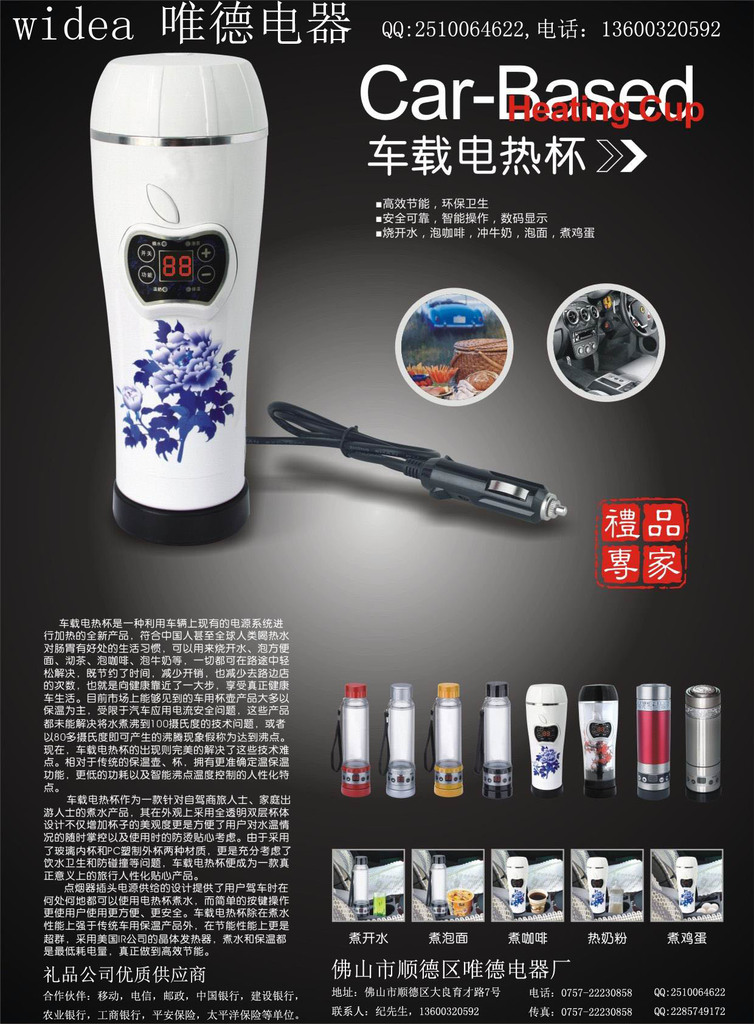 (三)点烟器插头电源供给提供了用户驾车时在何处何时都可以使用电热杯煮水,而轻触式的感应按键操作使得用户使用更加安全便捷,多重保障。独特防烫中空夹层科学结构设计!