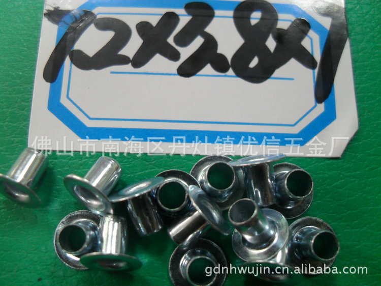 鸡眼铆钉通常用于服饰,产品广泛用于电子,电器、鞋类、手袋、皮带、服装等,用作铆合,装饰、紧固、穿孔等作用。实心需要再次铆接,用于重工件联结,常为不可拆结构,半空心铆钉应用最为广泛,束口(线径尾部较小)钉使用硬质线材制造,能不需预孔穿透0.5mm厚度内的钢板,铆钉不能弯曲变形,广泛应用在密码箱,旅行箱和箱包上面,中空钉(半空心铆钉)则使用软线制造,一般要求铆开后不能开裂,有很多种类型,目前对一些玩具上面的轴已经开始大面积使用半空心钉或子母钉替代,能大幅降低生产成本。抽芯和击芯铆钉则多用于较为薄软材料的铆接,一般要求不严格,制造用材通常用塑性较好的材料生产。 材质有:铜、铁、铝、不锈钢,通过热镀及抛光处理,使表面形成保护层,具有抗静电,防腐蚀,抗过敏性等作用。颜色可以白镍,光锡、仿金、青古铜、哑镍、青铜、锌、银等。鸡眼、空心铆钉的款式多样,种类齐全,精密环保,可以来样订做,也可以设计开模。标准公差为:外管径:正0负0.05MM 长度为:正0.1负0MM 头径为:正0负0.05MM,也可按各户的要求打样生产。