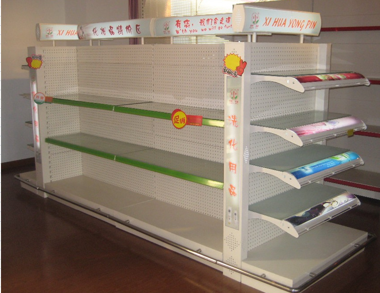洗化架:是大型商场洗化区的专用货架,精美独特的灯箱灯光效果,带不锈钢防撞条的底座,美观安全,高雅大方,组合方便。