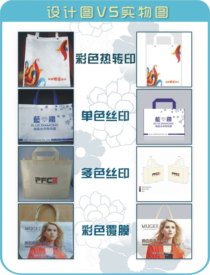 眼,让不同品味的广告商家都能切合需求.客户在定制袋子时有以下选择:材料:无纺布克重在70g-120g,颜色有几十种任你选择